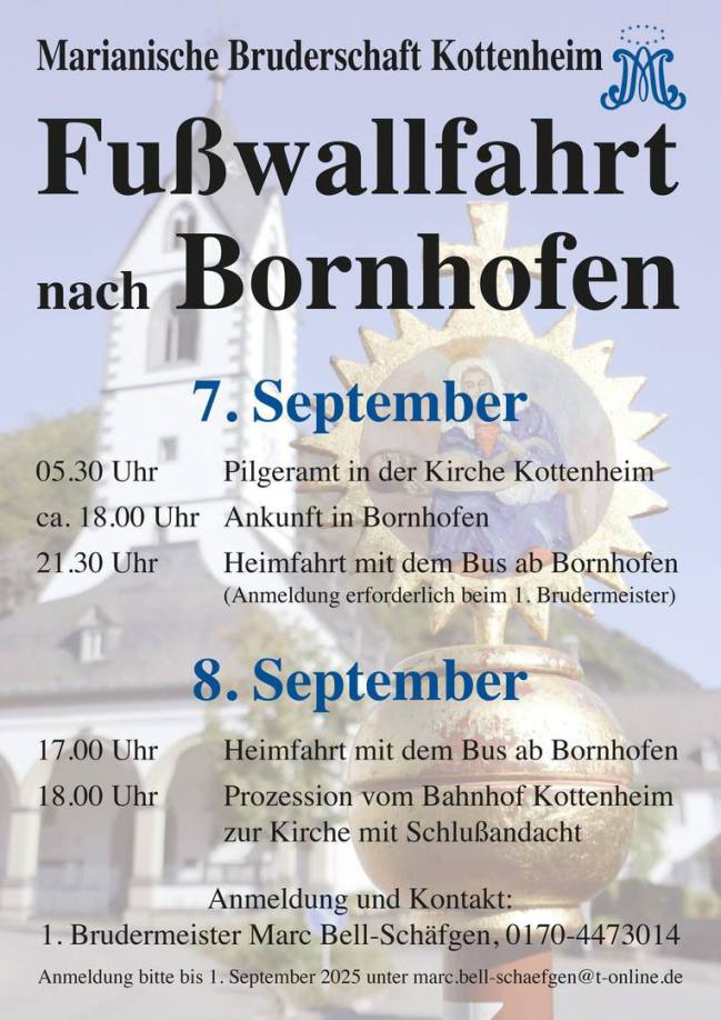 Die Brudermeister der Marianischen Bruderschaft Kottenheim laden auch in diesem Jahr wieder zur traditionellen Fußwallfahrt zum Gnadenbild der "Schmerzhaften Muttergottes von Bornhofen" ein. Unter Einhaltung der coronabedingt, aktuell gültigen Hygienevorschriften und Abstandsregelungen, können wir die diesjährige Wallfahrt erfreulicherweise durchführen.